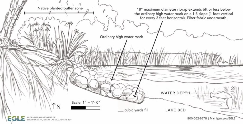 Adding plants that have properties of root structures that enhance the strength of the shoreline is a good method to strengthen a rip rap protected shoreline. There can in fact be benefits to some aquatic life within a rip rap design. EGLE has recently changed the rules for rip rap to have a slope with a more gradual height to length proportion.
